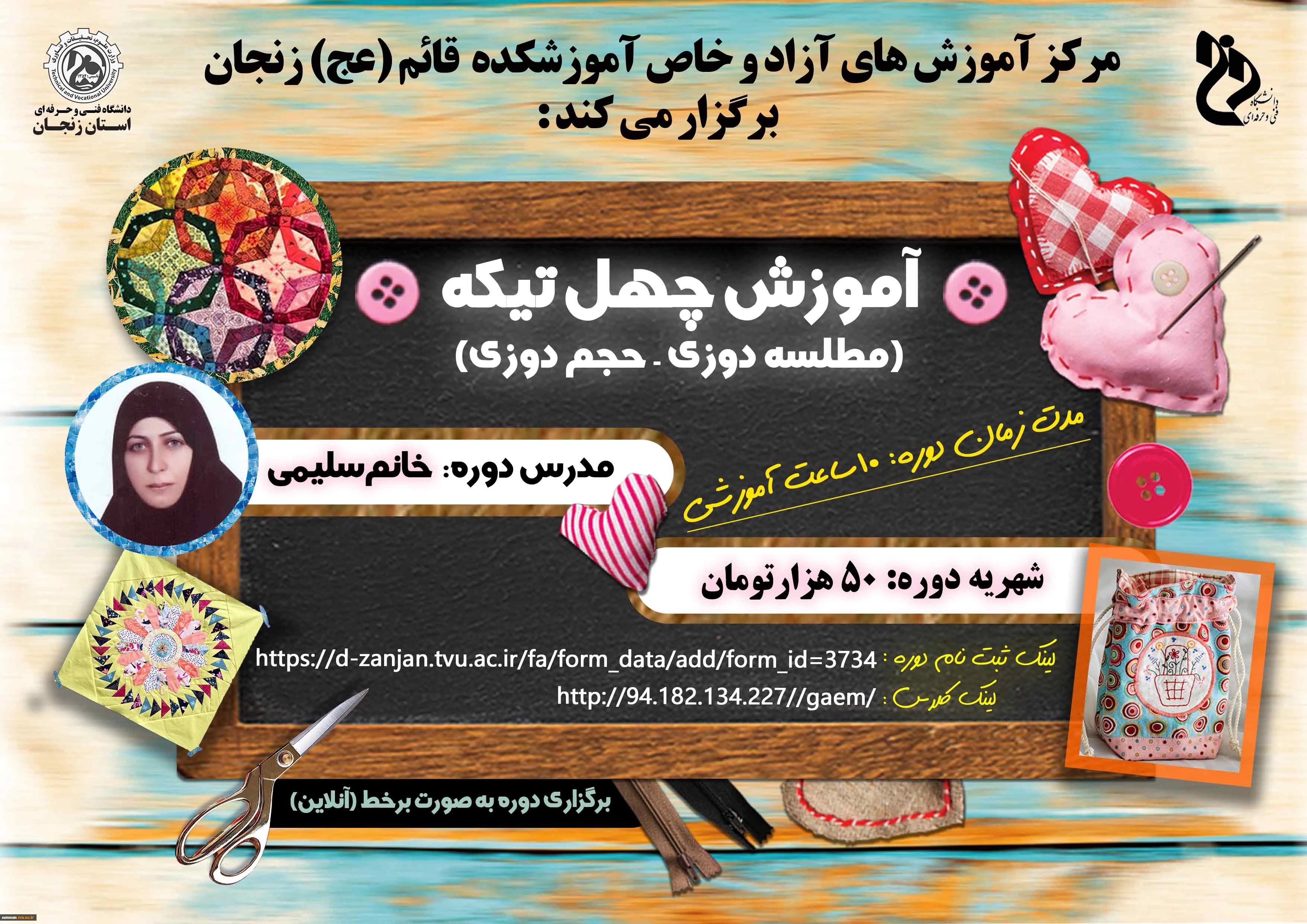 امتیاز دهید : برگزاری دوره آموزش مجازی چهل تیکه (مطلسع دوزی- حجم دوزی) 2 دوشنبه 17 آبان 1400 ساعت 8:08