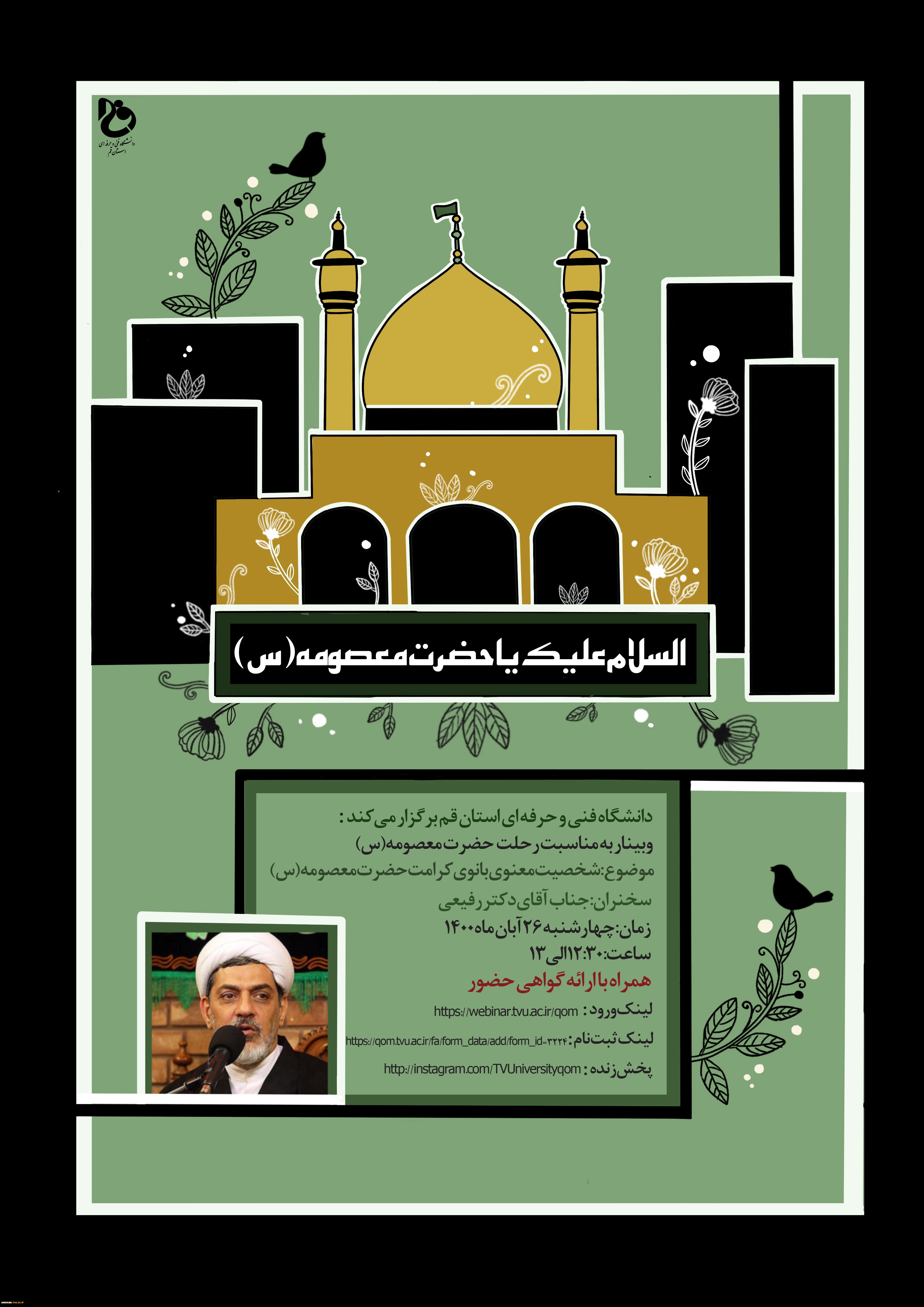 امتیاز دهید : دعوت نامه وبینار کشوری مقام معنوی حضرت فاطمه معصومه (س) با سخنرانی دکتر رفیعی 26 آبان 2 سهشنبه 25 آبان 1400 ساعت 8:42