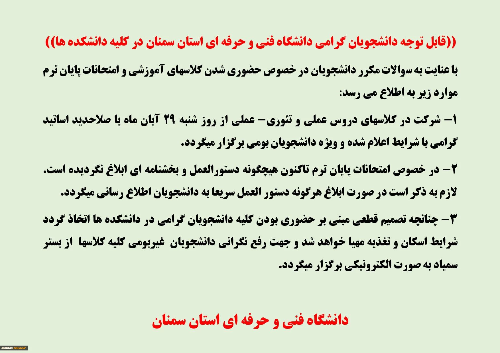 امتیاز دهید : قابل توجه دانشجویان گرامی دانشگاه فنی و حرفه ای استان سمنان در کلیه دانشکده ها اطلاعیه برگزاری کلاسهای حضوری دروس عملی 2 چهارشنبه 26 آبان 1400 ساعت 14:10