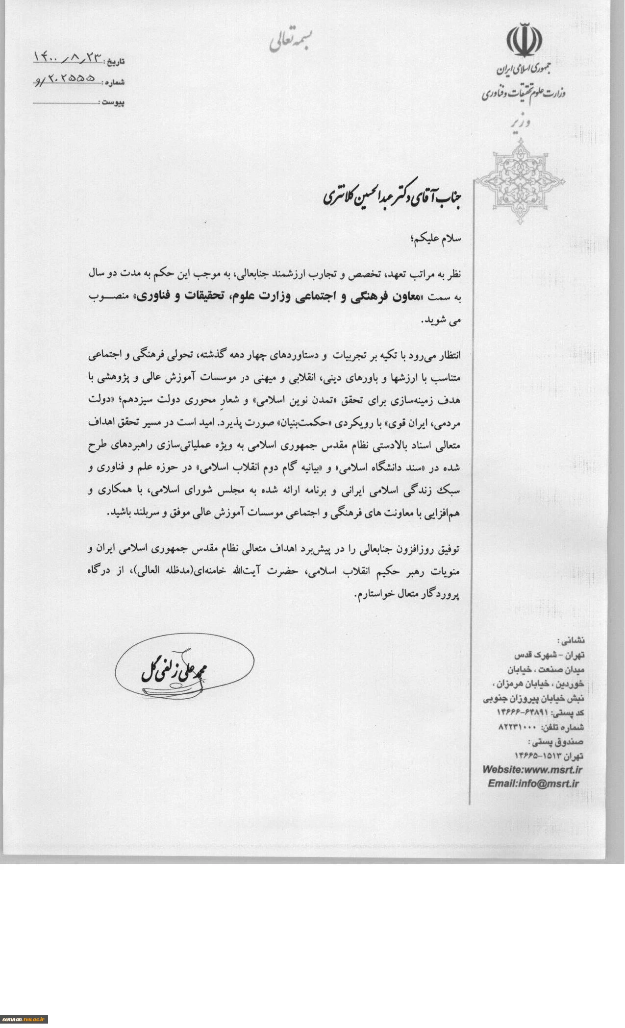امتیاز دهید : انتصاب آقای دکتر عبدالحسین کلانتری بعنوان معاون فرهنگی و اجتماعی وزارت علوم ، تحقیقات و فناوری 2 شنبه 29 آبان 1400 ساعت 12:58