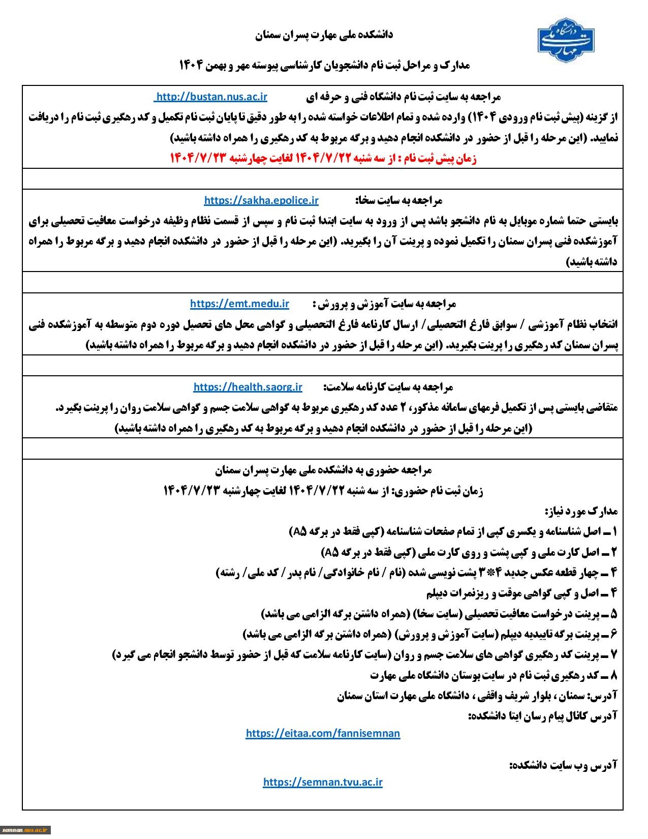 امتیاز دهید : مدارک و مراحل ثبت نام دانشجویان مقطع کارشناسی پیوسته ورودی های مهر و بهمن 1404 2 دوشنبه 21 مهر 1404 ساعت 10:35